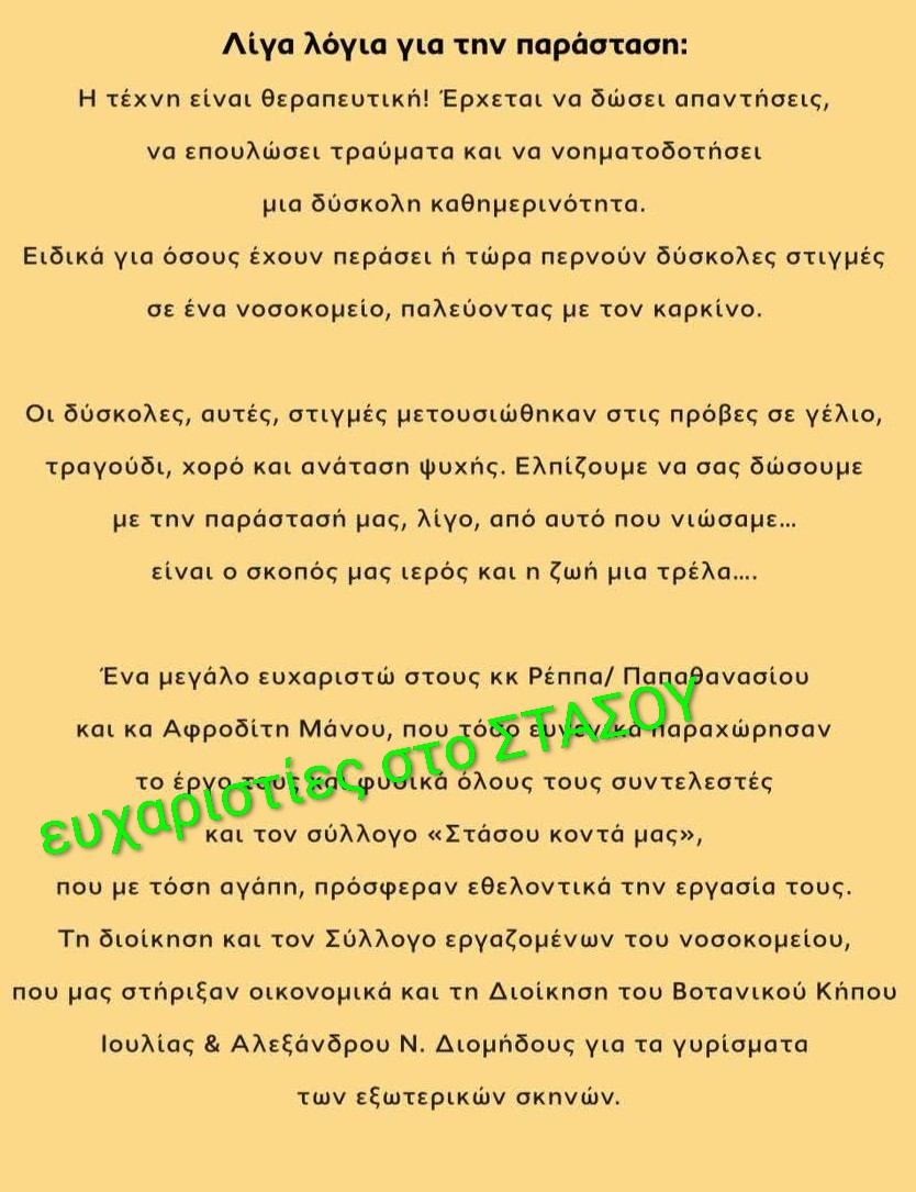 Ο Σύνδεσμος Εθελοντών «ΣΤΑΣΟΥ ΚΟΝΤΑ ΜΑΣ» εκπροσωπήθηκε με συμμετοχές μελών του (ηθοποιοί, σκηνικά,εκτύπωση προγραμμάτων κλπ) και επιπλέον ανέλαβε την ενημερωση όλων των ασθενών( κ συνόδων) του Νοσοκομείου από την παραμονή και τη συνοδεία ασθενών προκειμένου να κατέβουν στο Αμφιθέατρο τις μερες των παραστάσεων .Καινστις τρεις παραστάσεις οομεθελοντες του ΣΤΑΣΟΥ ΚΟΝΤΑ ΜΑΣ φρόντισαν για την υποδοχή και ταξιθεσια των θεατών, ενημερώνοντας τους ενδιαφερόμενους για τη δράση του Συνδέσμου.